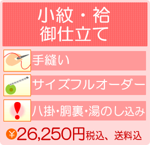 着物 きもの 小紋 仕立 【KW●1125】 付属 最高級胴裏レピア (参考上代¥12000-) 正絹八掛 (参考上代¥12000-) 湯のし (参考上代¥2000-) 手縫い仕立 熟練された手縫い職人さんによる丁寧な縫いあがりは皆さんに大変満足して頂いております。ごあんしん下さいませ。 ※特急お仕立ての場合 お急ぎの場合は大変お手数ですがお問合せ下さいませ。 (お問い合わはコチラから) 納期 納期50日前後その他加工等の兼合いで多少前後します。 特急お仕立て(30日前後)でお受けることが出来ます。 寸法記入はこちらから 紋入れはこちらから